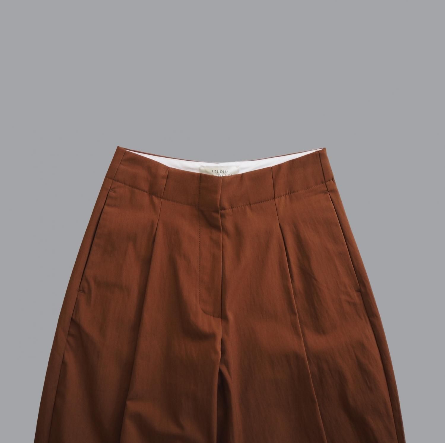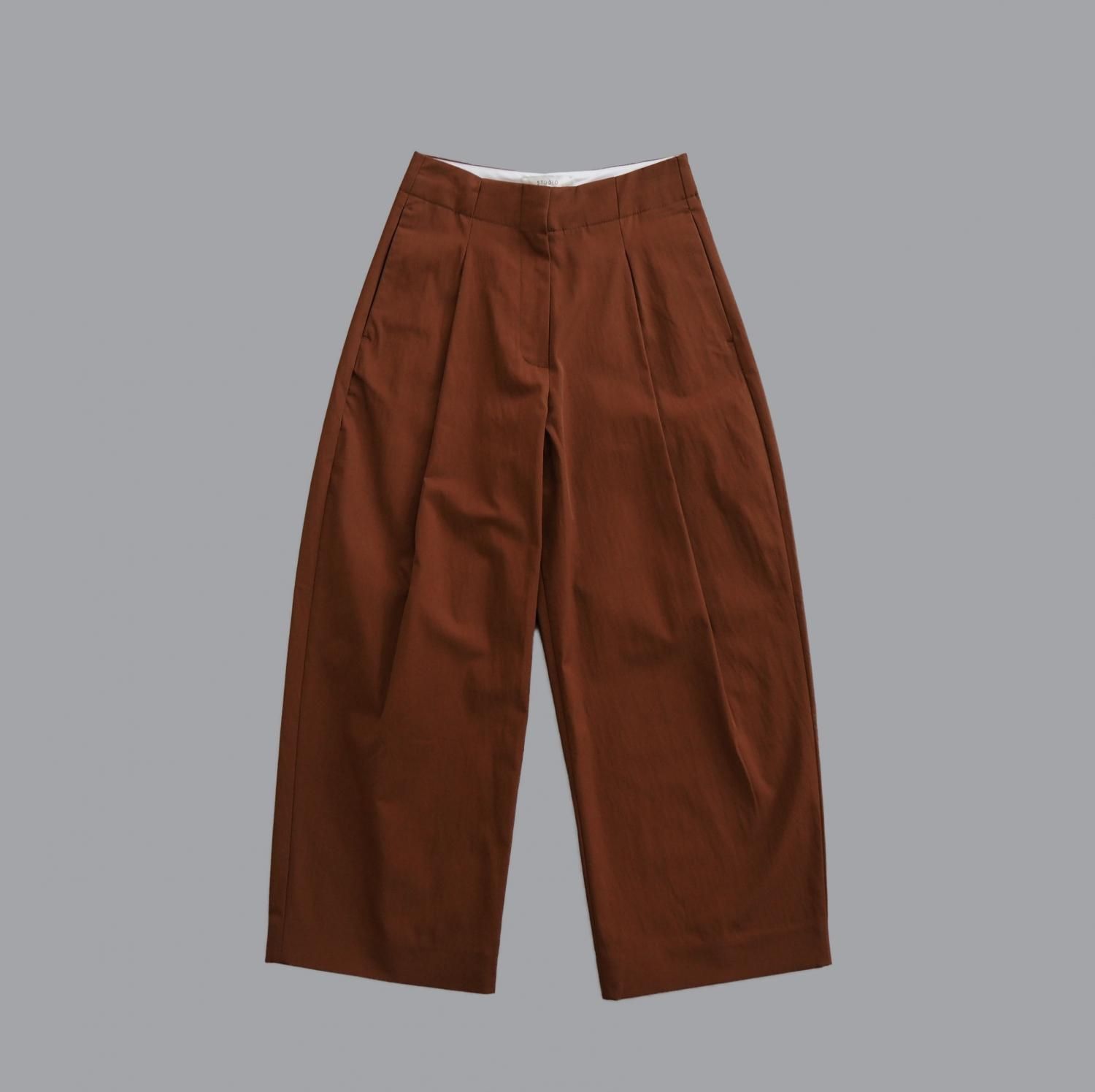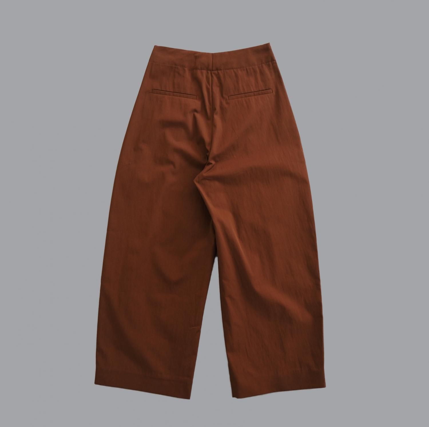 サラリとしたコットンナイロン生地、オールシーズン着用可能な程よい厚みのワイドパンツです。ウエストから膝、裾にかけてテーパードしていて、緩やかなカーブと立体的な丸みが特徴。シンプルなトップスとあわせればパンツが主役になる一本です。